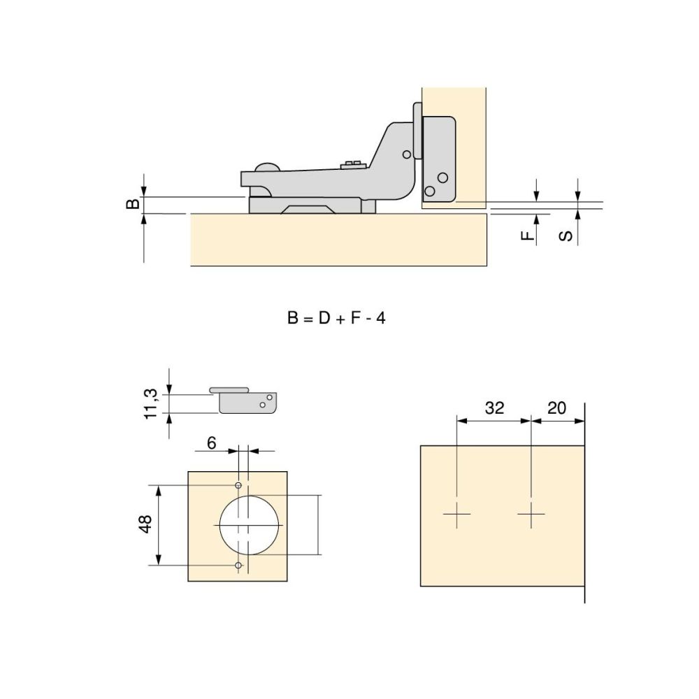 - Embase à visser hauteur 1. Réglage de la hauteur de la porte par excentriques ±1,5 mm. Grâce à sa conception technique, l'embase, lorsqu'elle est installée avec la charnière, reste dissimulée sous le bras de la charnière.